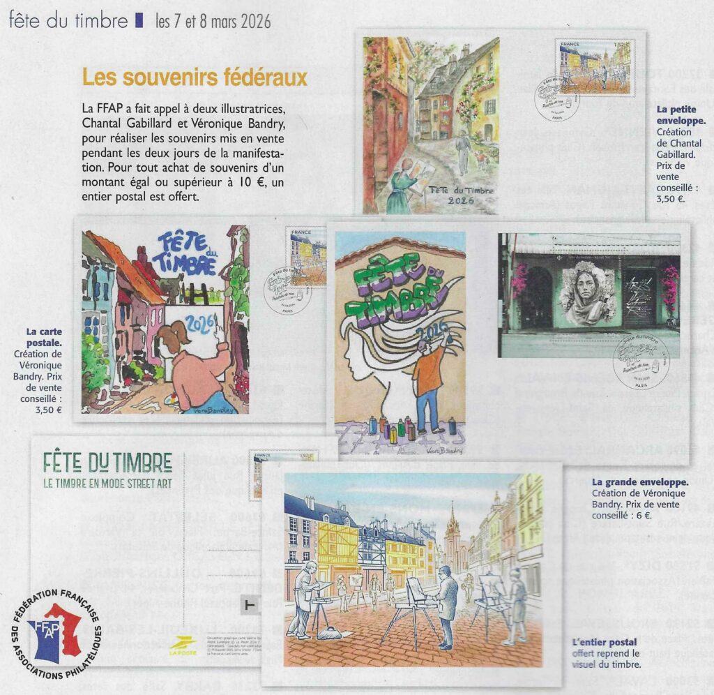 Reproduction des souvenirs disponibles pour la Fête du Timbre (extrait de Timbres Magazine n° 286 de mars 2026) :